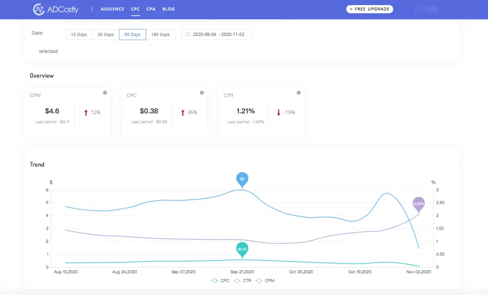 A free Facebook ads cost tool. They provide all the advertising data indicators including Facebook, Instagram, Messenger, Audience Network. You can query the average CPC, CPM, CTR and CPA benchmarks of different industries. In addition, you can also expand Facebook interests. Different interests have different country data analysis, and each interest has detailed CPC and CPM.