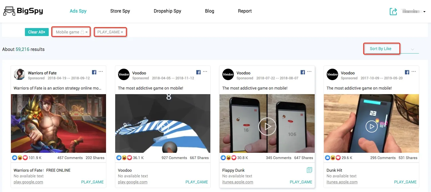 Use spy tools to find the ads that are most popular with users, then learn and analyze its creative ideas and learn to imitate. Let’s take bigspy as an example to find the most popular game ads: