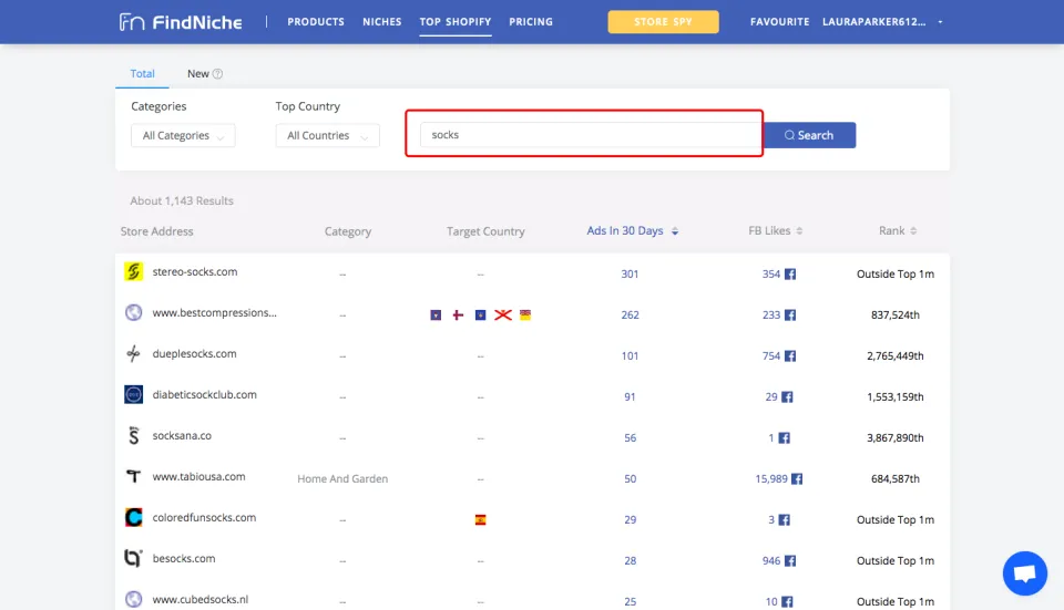 You can easily find your Shopify competitors' Facebook page through FindNiche. As it has shown below, when I search this term "socks" on the search bar, then I get results regarding Shopify stores that are selling socks or socks related products, then I could check their target countries, past 30-day Facebook ads, as well as their FB likes. And I can also enter into their store and their FB page to check what kind of marketing strategies they take to promote their Shopify stores.