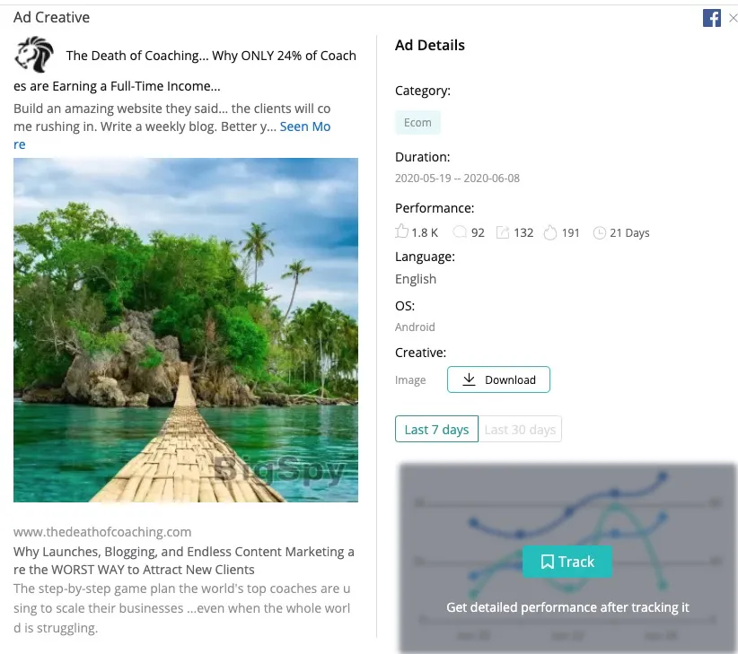 Track: After clicking track, you can track the ad performance, ad audience, landing page for the last 7 days, or the last 30 days.