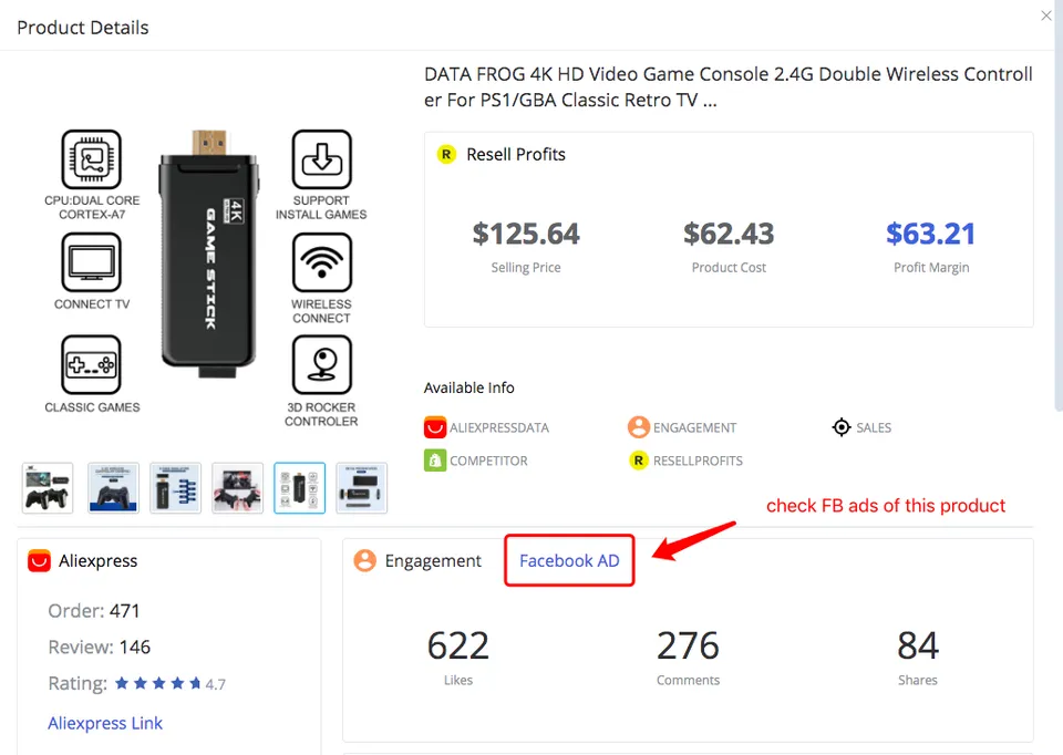 FindNiche is designed for dropshippers to find more dropshipping niches, the truth is, they made it. In one of their features, they will update 20 dropshipping niches picked through the AI algorithm on a daily basis. You can get a huge amount of product detailed information from it, such as product's price on AliExpress, Shopify store's selling price, product resell profit, as well as the number of Shopify stores that are selling this product, and more importantly, you can directly click to check the advertisement of this product on FB (as shown in the figure below). Find out the secrets of these FB ads regarding popular niche products, steal some inspiration or ideas from the successful cases, to optimize your ads, and make smarter decisions for your e-commerce business.