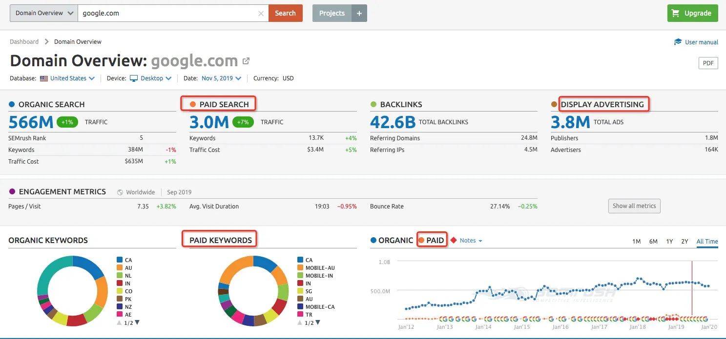 Semrush is a tool for keyword research that helps us analyze google keywords, research competitors’ google ads, and view display ads.