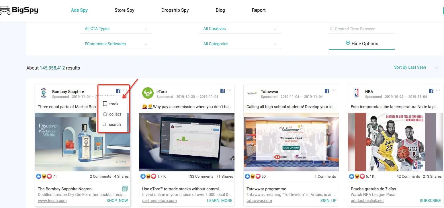 BigSpy is an ad creatives and copies spy tool. BigSpy monitors and tracks ads from many social channels. You can also use search filters to see the specific ad styles of your competitors and the performance of your ads.