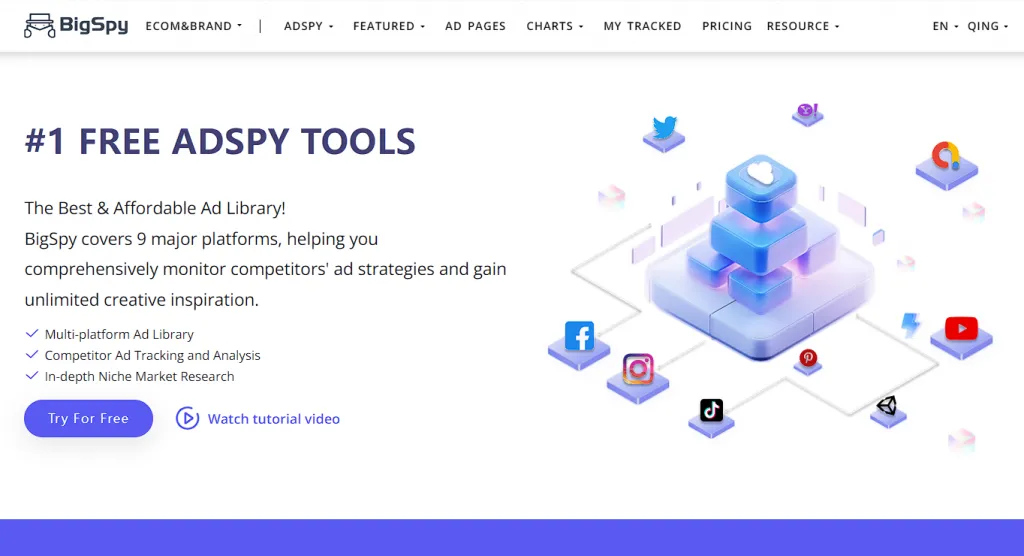 BigSpy, a free ad spy tool, takes a broader approach by allowing users to spy on ads across various social media platforms, including Facebook, X(twitter), Google, Pinterest, Instagram, Yahoo, and more. It serves as a comprehensive solution for understanding the advertising landscape from multiple angles and dimensions.