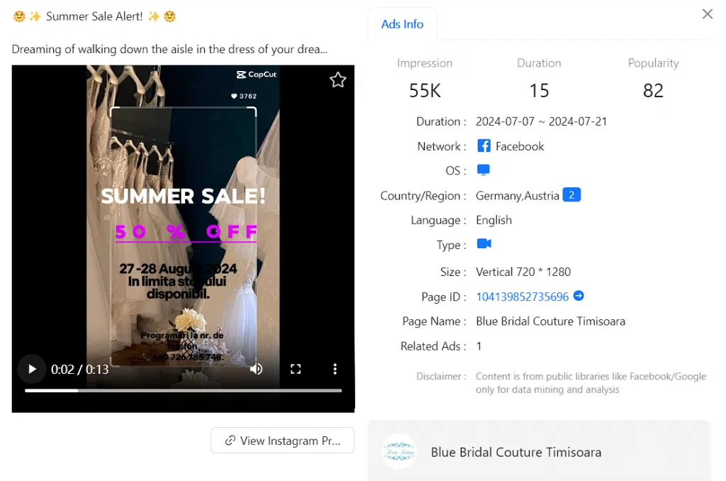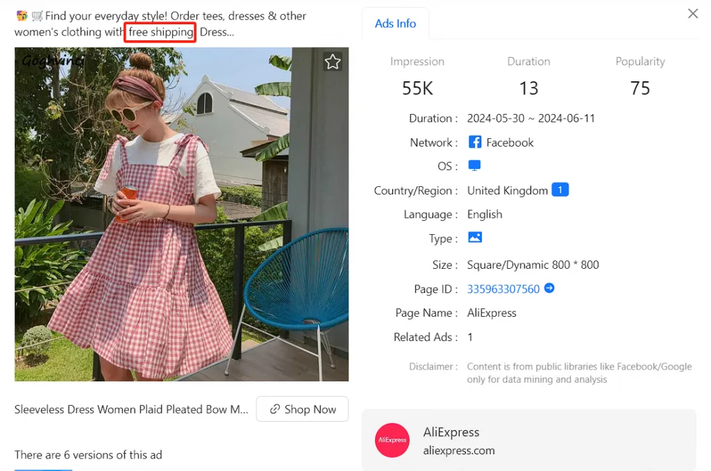 When searching for the keyword "dress" on BigSpy and sorting by user preferences, you'll notice that many ads feature copy containing keywords like "discount" and "promo code." These types of discounted clothing ads are always highly appealing because consumers’ enthusiasm for promotions is driven not only by the financial savings but also by the fear of missing out (FOMO) on a good deal. Therefore, businesses should take full advantage of discounts and promotions, not just to clear inventory but also to attract new customers by creating a sense of urgency with limited-time offers, thereby increasing brand visibility. Promotional activities can also effectively boost consumer engagement and conversion rates. In a highly competitive market, skillfully using discount strategies often leads to significant returns.