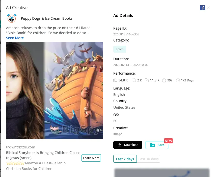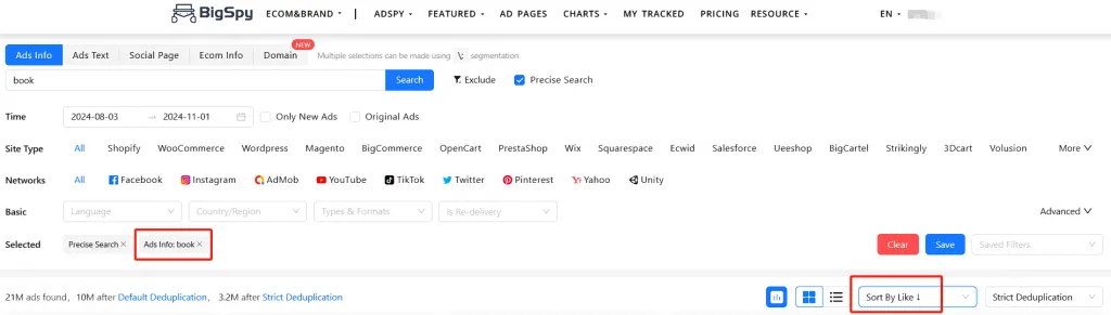 However, the production of videos takes more time than pictures, which is also a problem for many authors and publishers. And I don’t know how to optimize it to look like the audience. In fact, we can first observe what kind of advertising creatives are used by competitors of similar books, and select creatives with high interaction volume and long-lasting advertising (this is often the appearance of competitors optimized).We can also try out some ad spy tools to find high-quality ideas from competitors—here we take BigSpy as an example, search Books and sort by Like to find ideas with reference value.