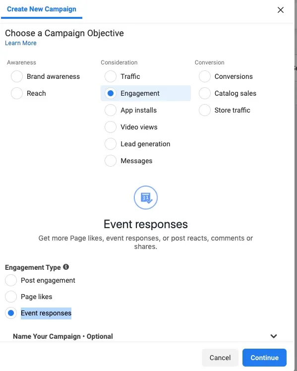 Engagement: Get more Page likes, event responses, or post reacts, comments, or shares. This marketing goal focuses on interaction with users. It will be delivered to users who are interested in posts. Its accuracy is higher than that of Reach. Relatively higher.