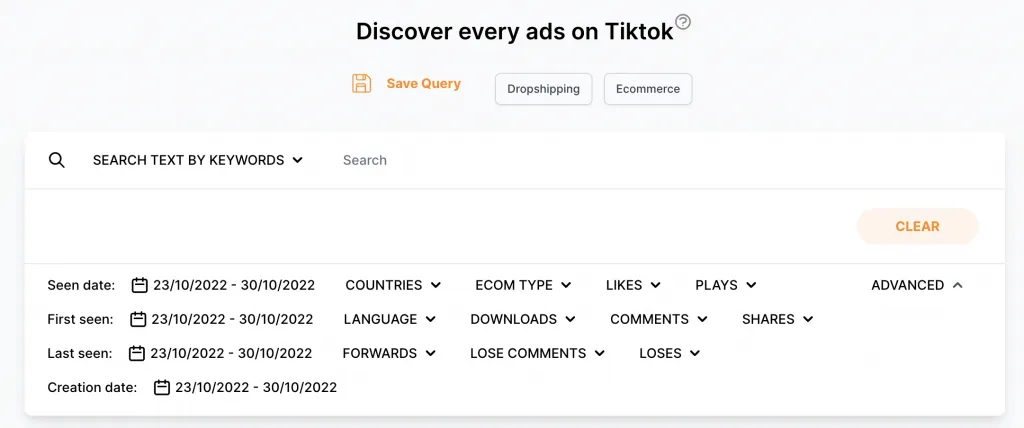 BigSpy を使用すると、広告の場所の検索を実行できます。ランディングページのURL、ID、広告情報、タイトル、テキストに基づいて検索できます。キーワード除外検索では、不要なキーワードを入力して、そのキーワードに関連する広告を除外できます。