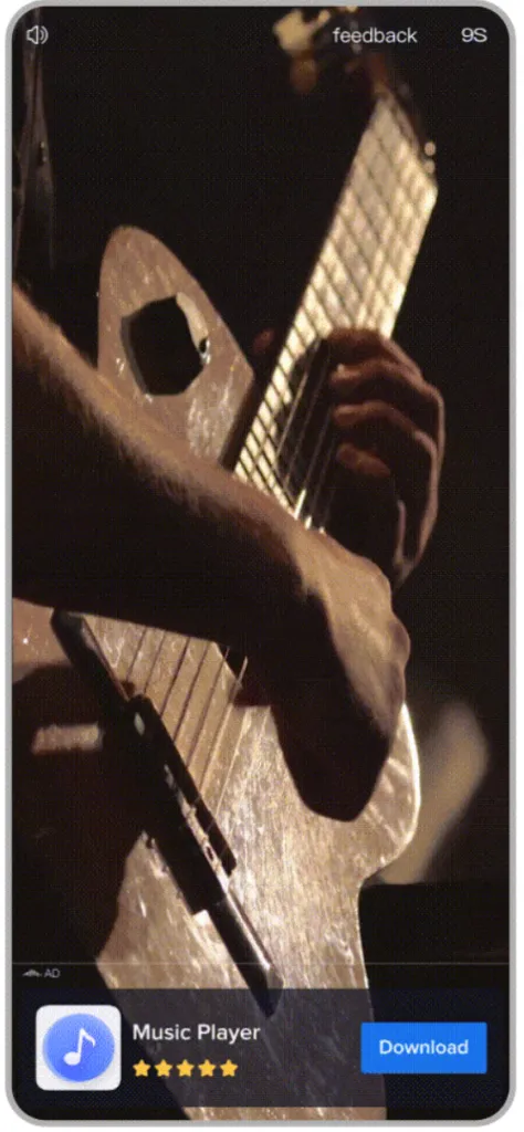 TikTok supports full-screen in-feed ads, providing a positive user experience and better ad interaction. After 9 seconds of video playback, an ad format like the "card download" shown in the image below will appear.