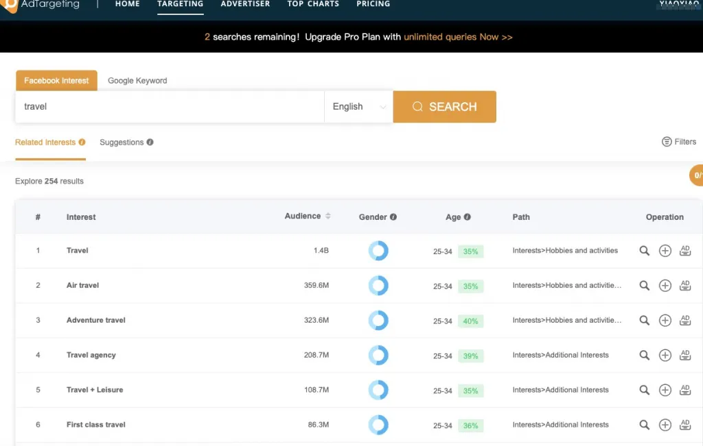 From the above creative design of advertising, we can find that any sunglasses are targeted at a specific audience. For example, black sunglasses with a metal frame are targeted at men in their 20s to 30s. Then we have to do with this specific In addition to the user characteristics, you can also traget such users through detailed interests. For example, through keywords: "travel" and other more precise targeting of advertising audiences by AdTargeting.