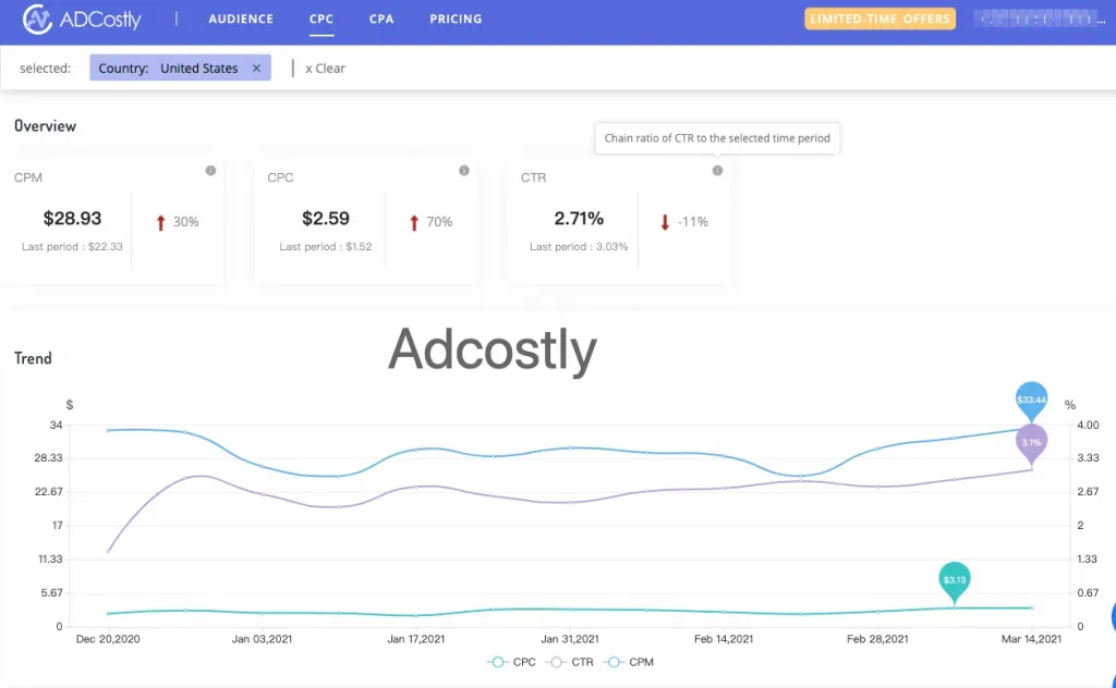 When we set up a new campaign, or place Facebook ads in a new country, advertising bidding or choosing which type of advertising is more suitable will require a long period of A/B testing, but now there is a tool (AdCostly) can help us reduce the test time, because AdCostly will calculate the average bid of each country and channel based on different advertising interest keywords, making it easier for us to test advertising costs.