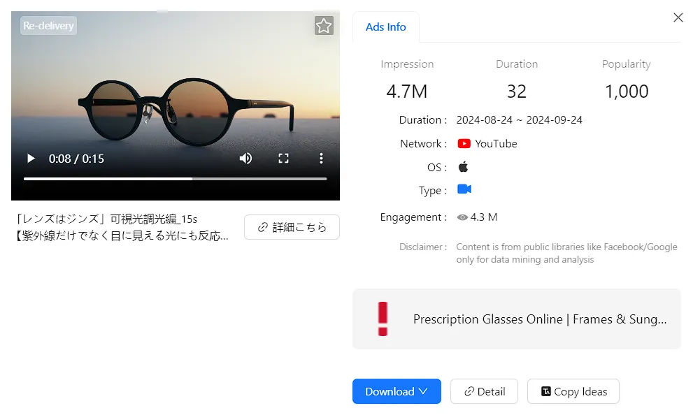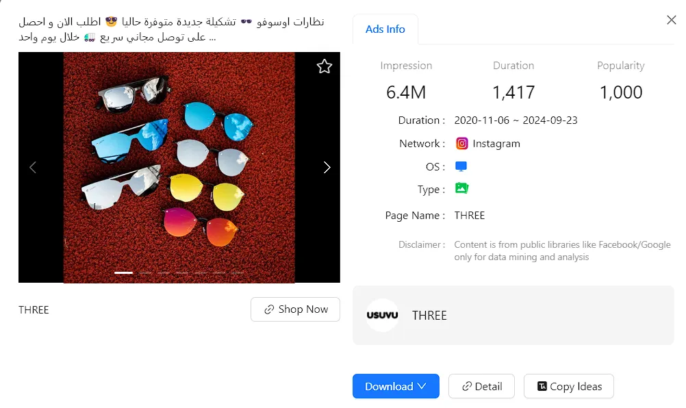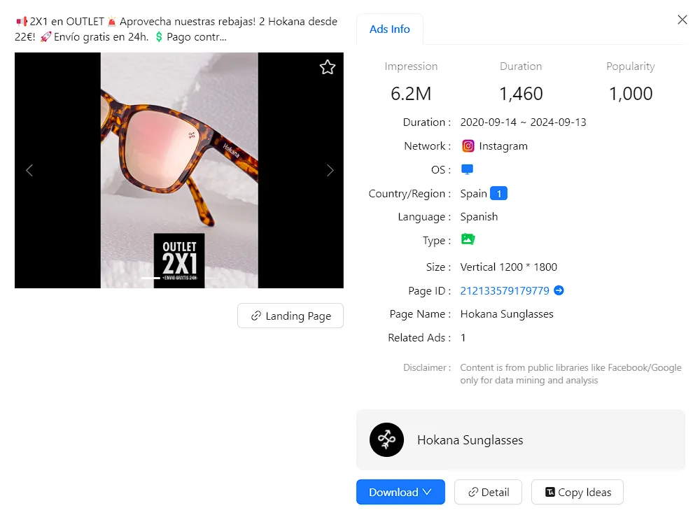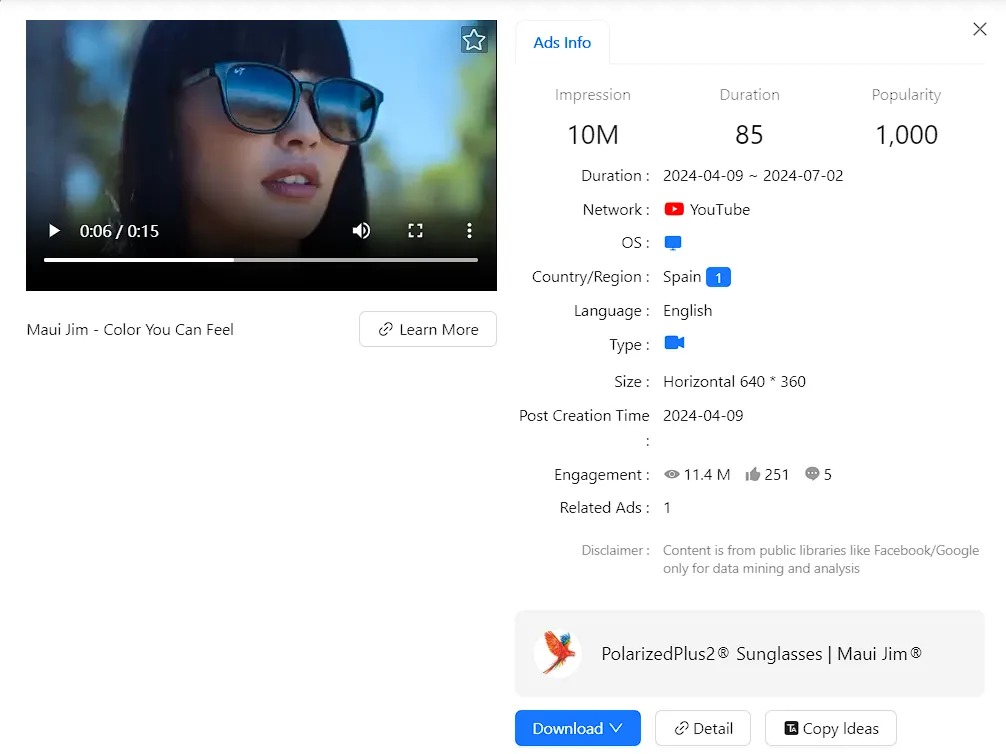 BigSpy is an advertising creative collection tool, which comes from a big data company. BigSpy aggregates advertisements from 9 social platforms including Facebook, Instagram, X(twitter), Youtube, etc., and helps users find better advertising ideas through search, advanced filtering and multiple sorting methods, helping us optimize our advertising campaigns and increase ROI. Below are 6 successful sunglasses ads I found on BigSpy.