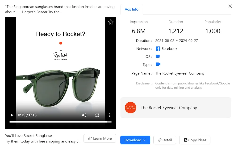 The Rocket Eyewear Company is a Singaporean sunglasses brand that focuses on combining fashion and functionality. This ad features a quote from the influential fashion magazine Harper’s Bazaar: "The Singaporean sunglasses brand that fashion insiders are raving about." It encourages consumers to try out the brand with free shipping and a 30-day hassle-free return policy. The ad showcases a 360-degree rotating video of a pair of sunglasses, fully displaying the product’s design and details. The ad copy is concise and to the point, highlighting what matters most to consumers: style and ease of purchase. The direct call-to-action, “Try them today,” motivates consumers to act immediately, while the offer of free shipping and easy returns helps drive conversions.