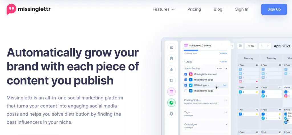 Missinglettr automates social media campaigns by turning blog posts into engaging social media content. It helps maintain a consistent social media presence with minimal effort by creating drip campaigns that automatically share content over time. Missinglettr’s platform offers features like scheduling, analytics, and collaboration, making it easier for users to manage their social media activities.